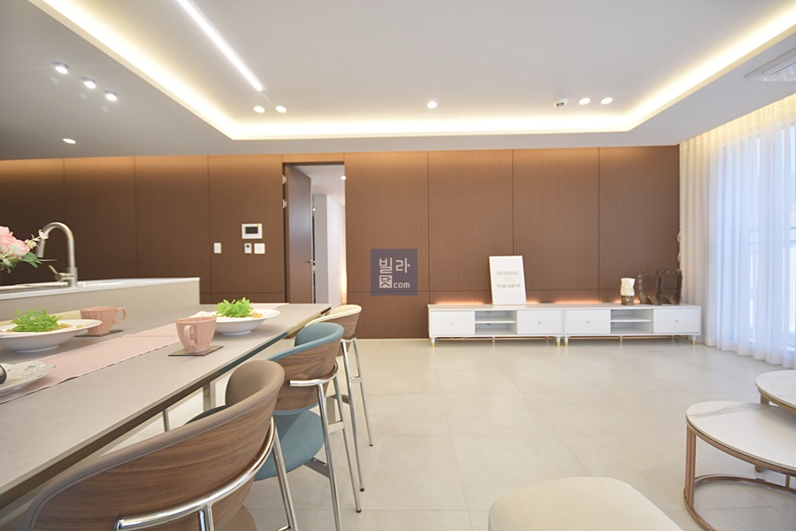 거실은 폭이 넓은 대형 공간으로 설계되어 여유롭습니다. 양창 구조로 되어 있어 채광과 통풍이 우수합니다. 바닥은 포쉐린타일로 시공되었으며, 천장에는 시스템에어컨이 설치되어 있어 무더운 여름에도 쾌적하게 지낼 수 있습니다.