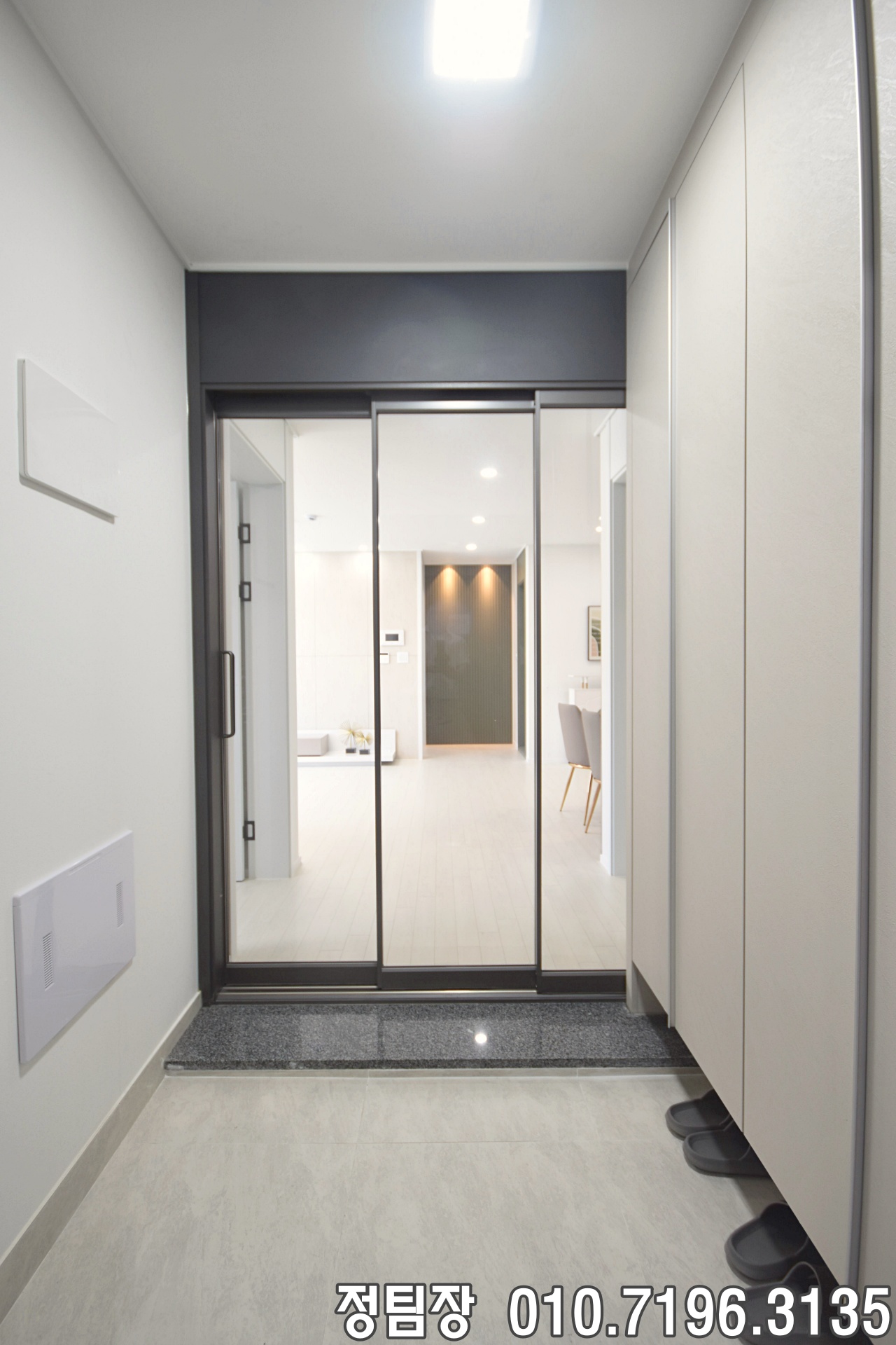 김포신축빌라매매 현관에는 3칸 구성의 신발장이 설치되어 수납이 용이했으며, 중문은 3연동 슬라이딩 타입으로 시공되어 외부 소음과 냉기 차단에 도움이 될 구조였습니다. 중문을 열고 들어와도 바로 거실이나 주방이 보이지 않는 구조라 사생활 보호 측면에서도 장점으로 느껴졌습니다.