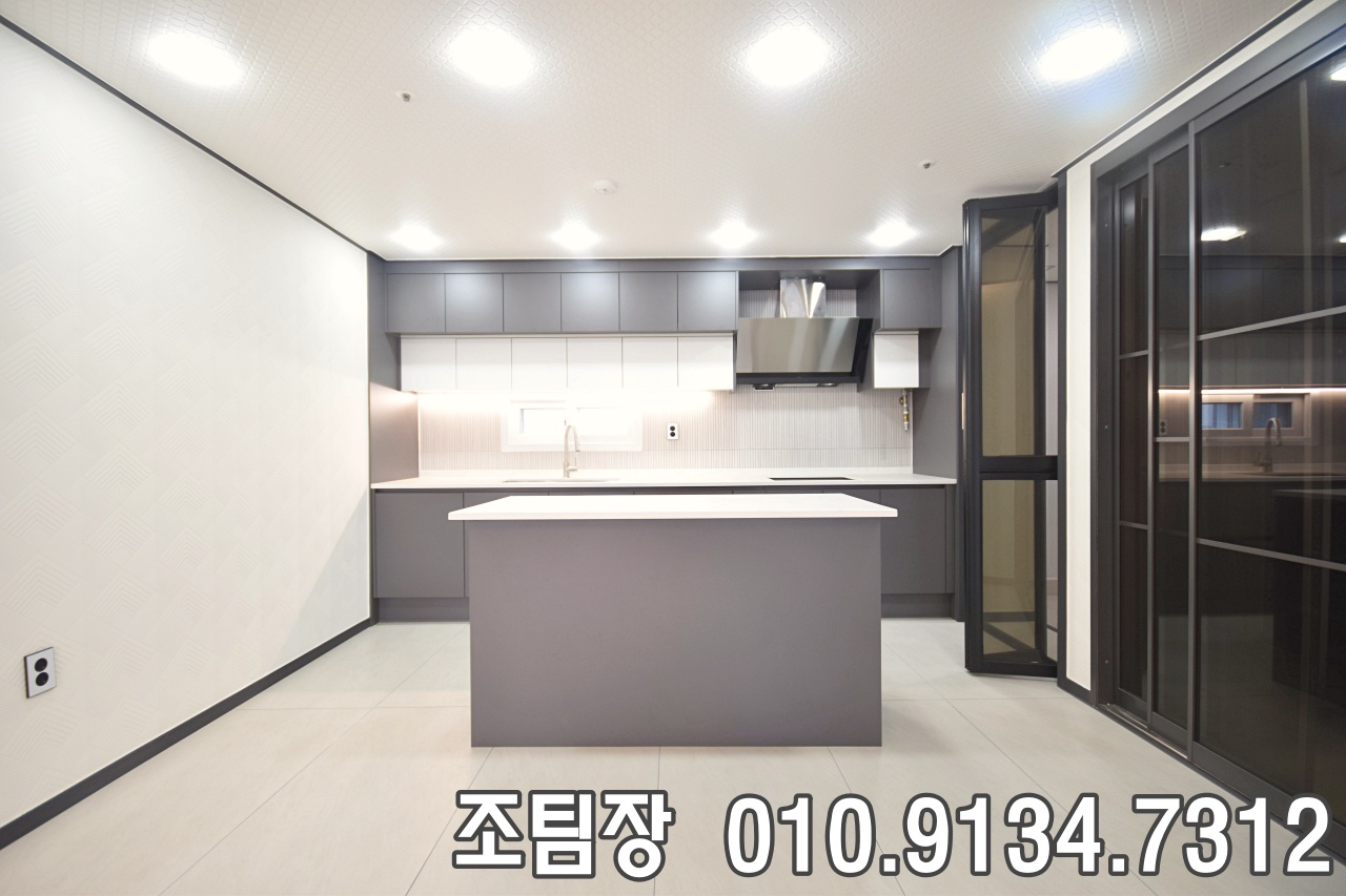 소사본동신축빌라 주방은 대면형 싱크대 구조로 시공되어 거실과의 소통이 자연스럽게 이루어지는 배치입니다. 아일랜드 식탁이 함께 구성되어 조리와 식사가 하나의 동선으로 이어지며, 실사용 편의성이 높게 느껴졌습니다. 가열대는 3구 전기 타입으로 설치되어 깔끔한 조리 환경을 유지할 수 있고, 수납장 구성도 여유로워 주방 살림이 많은 가정에서도 부족함이 없어 보였습니다.